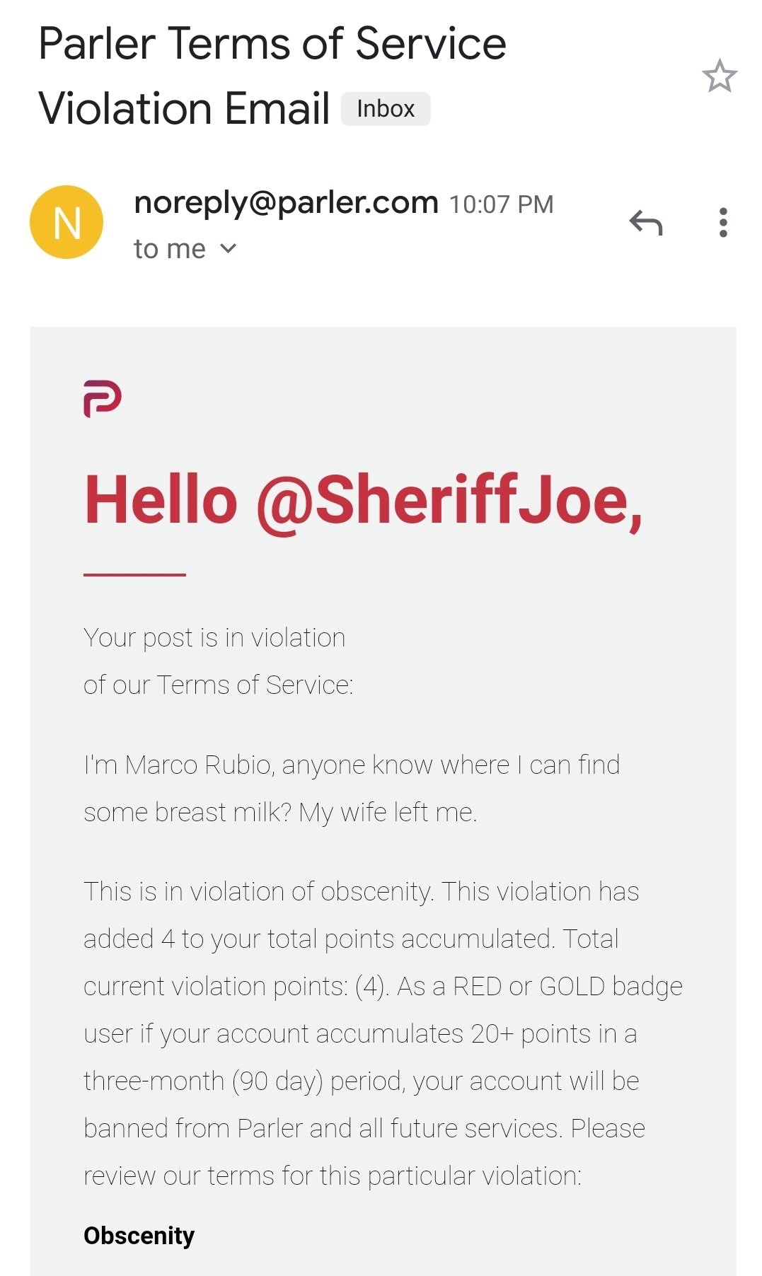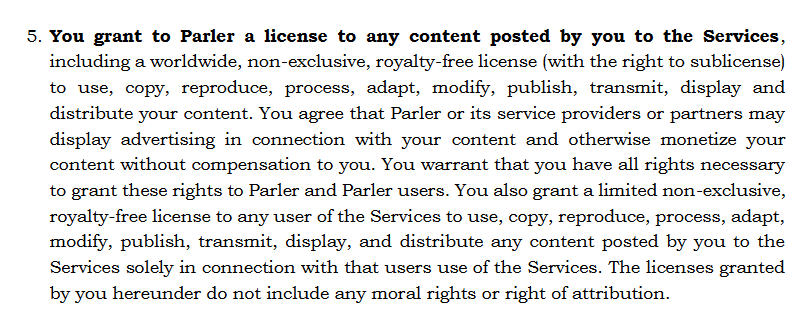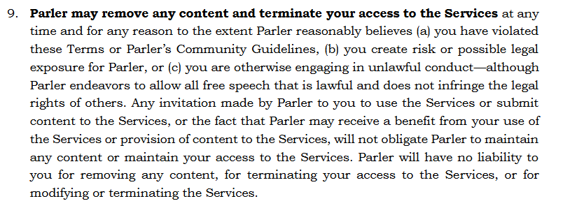 Here are some snippets from Parler's policies as of 11/20 (policy date 7/2020):