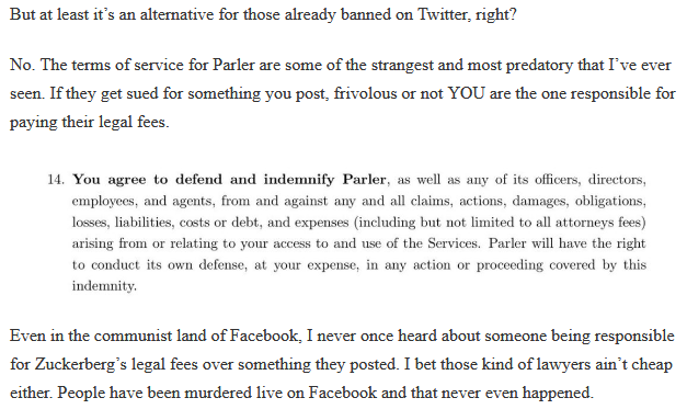 Among other things, users of Parler (as of this writing) have to cough up significant personal identification info, including but not limited to social security numbers, tax id numbers, photocopies of drivers licenses, passports and other forms of ID, that Parler will use to "verify" their ability to access basic features of the site that are available to most everybody without such restrictions and draconian, privacy-invading measures on other social media sites.